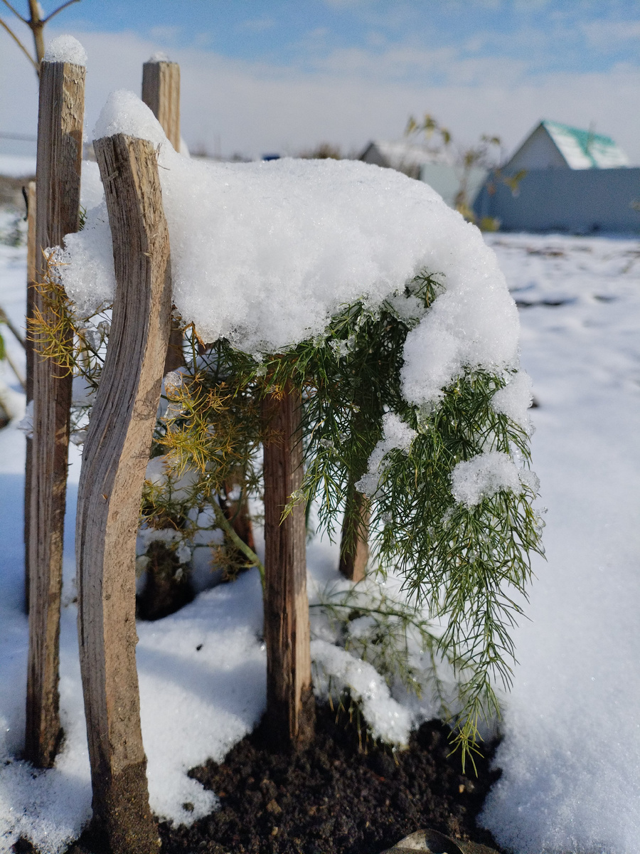Всё в природе прекрасно, что бы ни было. Под солнечными лучами всё красиво, после дождя завораживающее зрелище на цветах, и снег придаёт изысканность. Нежная молодая спаржа уверенно держит снежную шляпу и не противиться ей. Детка ёлка тоже как будто развела руки призывая снежинки. Покорно сколинила ветви и хризантема, ей рано, но она не спорит... Хвойные и снег это нечто взаимосвязанное и гармоничное. Вечер загадочен и спокоен в саду.