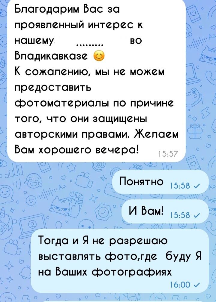 Возможно Я и не попала в кадр, но Мне так и не ответили Я есть на фото или нет Меня. Меня, конечно,это возмутило и Я Им отказала выставлять фото со Мной.Я во все не против авторских прав,но должна быть логика, на какие фото нужно оформлять и защищать, а какие нет. Коль Они защищают авторским правом свои работы,то и Я создание Творца❤️, защищённая правами, а также Я под защитой Высших Сил❤️.