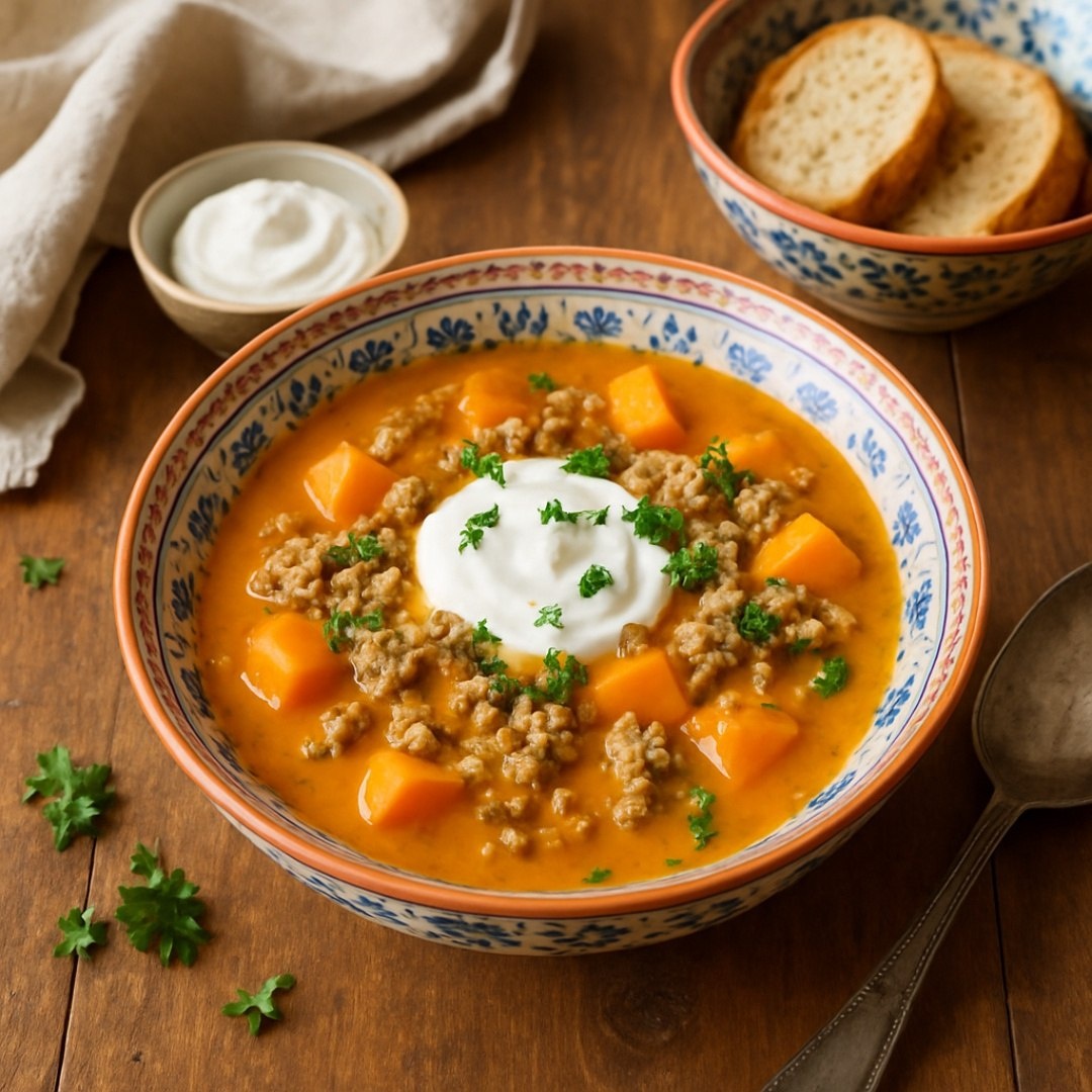 Тыквенный суп с фаршем Ингредиенты ⤵️ 🔸 Тыква – 600 г 🔸 Фарш мясной – 400 г 🔸 Картофель – 3 шт. 🔸 Морковь – 1 шт. 🔸 Лук репчатый – 2 шт. 🔸 Чеснок – 3 зубчика 🔸 Томатная паста – 2 ст.л. 🔸 Растительное масло – 3 ст.л. 🔸 Сметана – 50 г 🔸 Зелень – 1 пучок 🔸 Соль, перец – 1 щепотка 🔸 Лавровый лист – 2 шт. Приготовление🥣 1. Тыкву и картофель очистить, нарезать кубиками. Залить 2 л воды, варить 20 минут. 2. Лук и морковь нарезать, обжарить на масле до мягкости. 3. Добавить фарш, жарить 7-10 минут до румяности. 4. Добавить томатную пасту и измельченный чеснок, тушить 5 минут. 5. Овощи с тыквой измельчить блендером до кремовой консистенции. 6. Соединить суп-пюре с фаршем, добавить лавровый лист. 7. Варить 10 минут на медленном огне. Посолить, поперчить. 8. Подавать со сметаной и зеленью. Рецепт дня #тыквенный_суп #суп_пюре #фарш #мясо #овощи #специи #зелень #обед