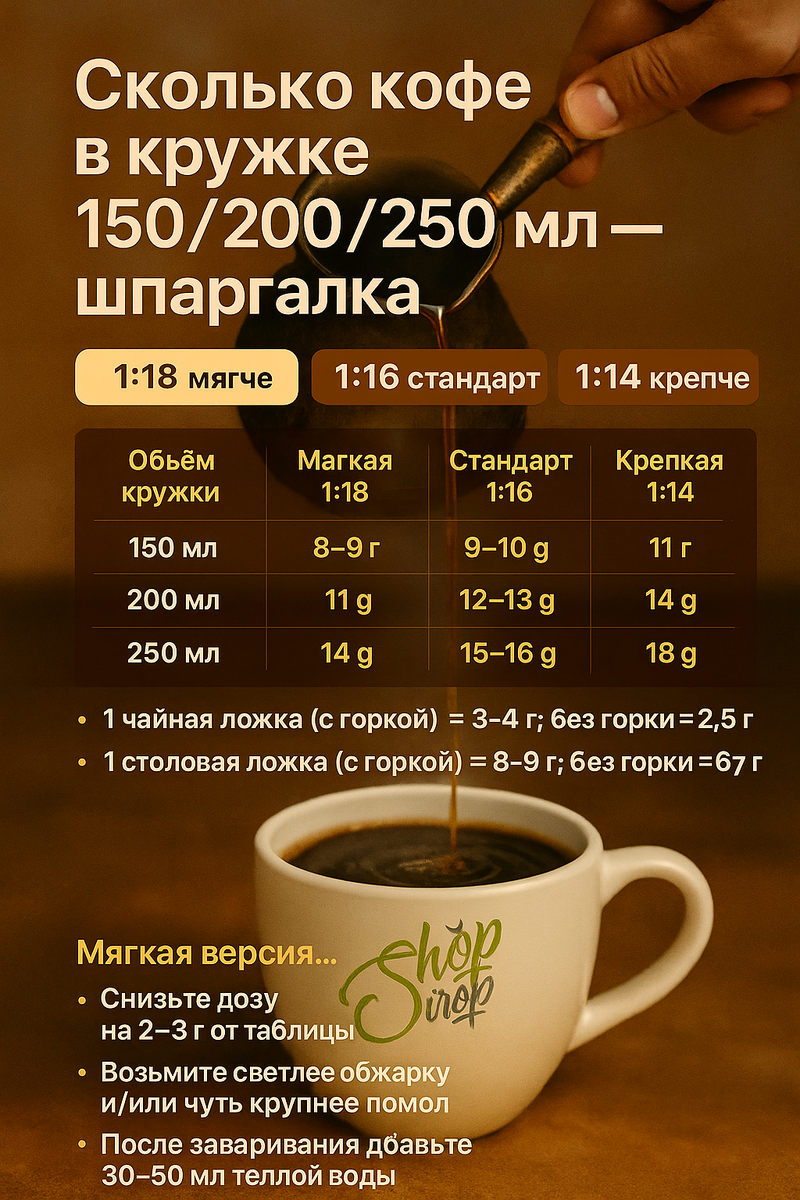 Коротко. Базовая формула для фильтр/домашней кружки — соотношение кофе к воде 1:16 (стандарт). Мягче — 1:18, крепче — 1:14. На картинке — готовые числа и «ложечки», чтобы варить без весов. «Мягкая версия», если «звенит» в голове Что запомнить. Думайте не про «сколько ложек», а про соотношение. Для дома держите в голове три числа: 1:18 / 1:16 / 1:14 — и подстраивайте под себя. Сохраняйте в закладки. А вы какой режим пьёте чаще — мягкий, стандарт или крепкий?
