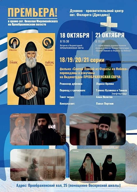 18, 19, 20, 21 серии фильма «Святой Паисий из Фарасы на Небеса» переведены и озвучены на Видеостудии ПРЕОБРАЖЕНСКАЯ СВЕЧА: