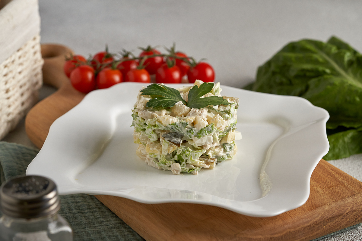 Классический способ подачи «Столичного» — в виде аккуратной горки. Выложите салат на тарелку, застеленную листьями салата, и слегка уплотните. Для идеальной формы можно использовать кулинарное кольцо.