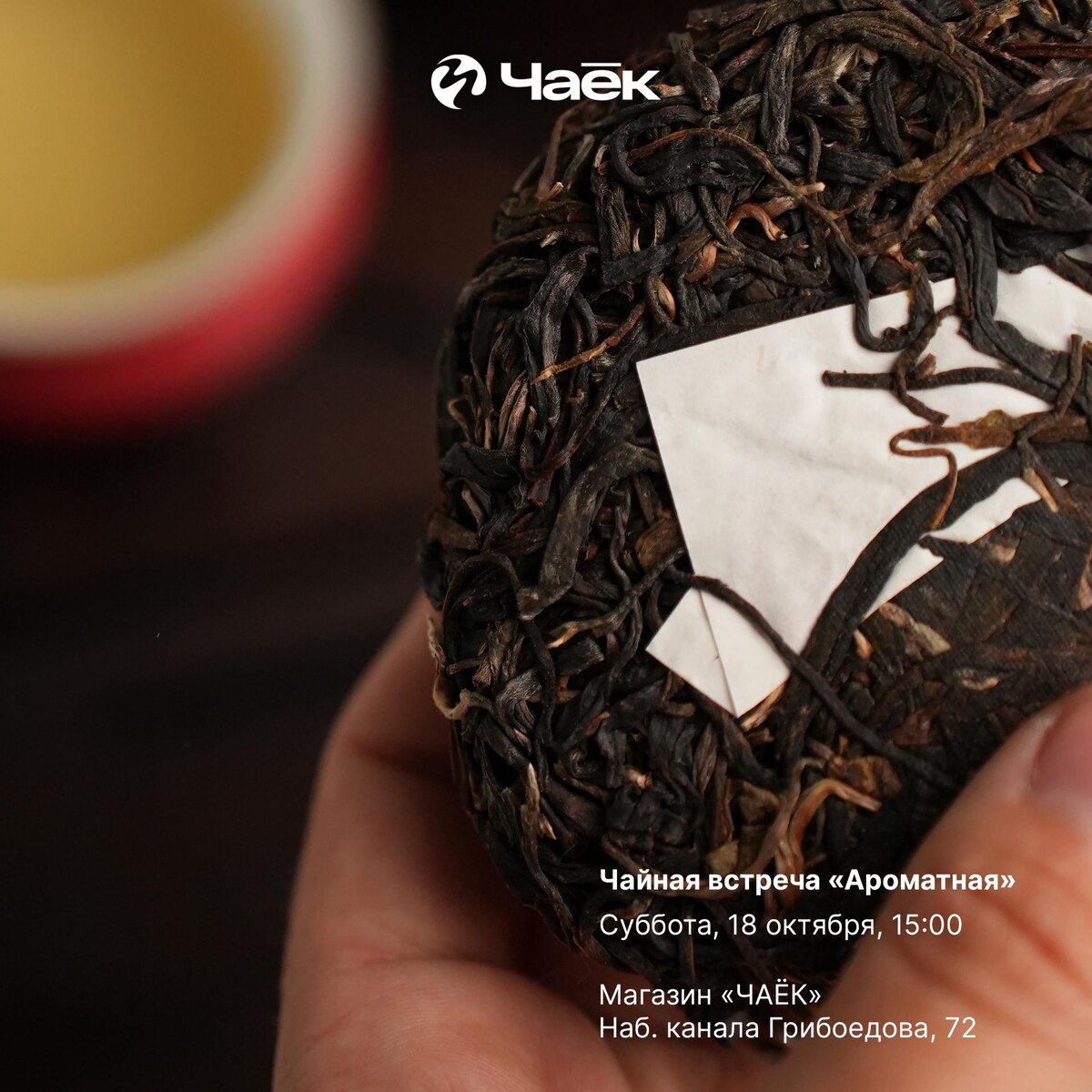 🍵 Чайная встреча 18 октября 1. «Ароматная» Для погружения в ароматный мир чая существует набор натуральных эфирных масел. С их помощью вы сможете развить своё обоняние и научитесь распознавать тончайшие ароматы, скрытые в чае. Приглашаем вас на встречу, на которой мы не просто будем наслаждаться чаем, но и в увлекательной форме тренировать «насмотренность» ароматами, открывая для себя новые грани! 📅 Суббота, 18 октября, 15:00 👤 Саша 💵 900 ₽ 2. «Тет-а-тет» Вы можете записаться на индивидуальную чайную встречу, выбрав удобное для себя время, количество гостей и свою тему для мероприятия. 📅 Любой день 💵 от 3 500 ₽ 👉 Записаться Место встречи: магазин «ЧАЁК». Правила посещения и записи. Каждому гостю полагается бонус! #встреча@chaekshop