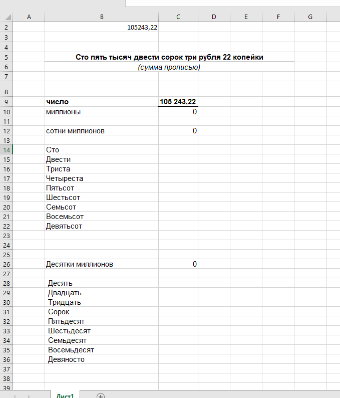 115 → "сто пятнадцать рублей" (особые формы 11-19) ✅ Работает в любой версии Excel — только стандартные функции