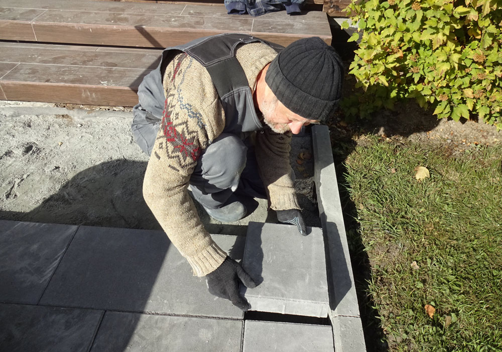 Ну, их тут несколько, например, запил лучше делать немного под углом, так, чтобы нижняя сторона плитки была чуть меньше размером. Тогда она более плотно прижмётся к поребрику или к соседке.
