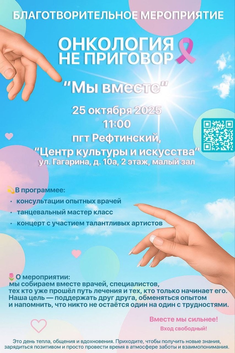 🎗 БЛАГОТВОРИТЕЛЬНОЕ МЕРОПРИЯТИЕ «МЫ ВМЕСТЕ» 📅 Когда: 25 октября 2025 года, 11:00 📍 Где: пгт Рефтинский, ул. Гагарина, д. 10а, «Центр культуры и искусства», 2 этаж, малый зал 🎤 На мероприятии выступит Лейла Боня — талантливая певица, успешный предприниматель и вдохновляющая мама двоих детей. Её творчество наполнено теплотой и энергией, а песни заряжают позитивом и верой в лучшее. 💡 Почему стоит прийти? ✅ Получить новые знания и вдохновение ✅ Зарядиться позитивом и хорошим настроением ✅ Провести время в атмосфере заботы и взаимопонимания 🎟 Вход свободный! Приходите всей семьёй и друзьями — вместе мы сделаем этот день особенным! #МыВместе #Благотворительность #ЛейлаБоня #Рефтинский