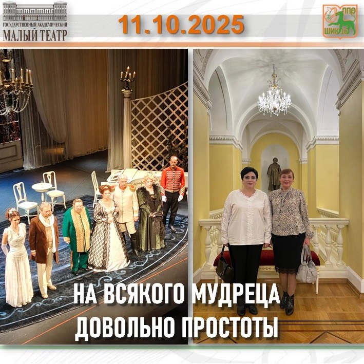 🎭 11 октября 2025 года член первичной профсоюзной организаций ГАОУ Школа «ШИК 16» О.Н.Авдеева смотрела спектакль «На всякого мудреца довольно простоты» по одноименной пьесе А.Н.Островского в Малом театре. «Это одна из тех пьес, которые во все времена звучат остро и злободневно. Каким путём, каким способом можно сделать карьеру и выбиться в люди? Как создаются и гибнут человеческие репутации? Островский и Малый театр отвечают на эти вопросы, рассказывая историю молодого человека по фамилии Глумов, решившего, во что бы то ни стало добиться высокого положения в обществе. Прекрасный спектакль в лучших классических традициях Малого театра и с великолепным актерским составом идет неизменно с аншлагом Спасибо первичной профсоюзной организации организаций ГАОУ Школа «ШИК 16» за возможность смотреть спектакли в Малом театре». #ПРОмалый #МалыйТеатр #МойТеатральныйМарафон