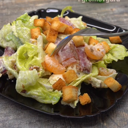 Он выглядит эффектно, пахнет новогодне, а на вкус — как будто сразу несколько блюд в одном: хрустящие листья салата, цитрусовая нотка, нежный йогуртовый соус и солоноватое вяленое мясо.