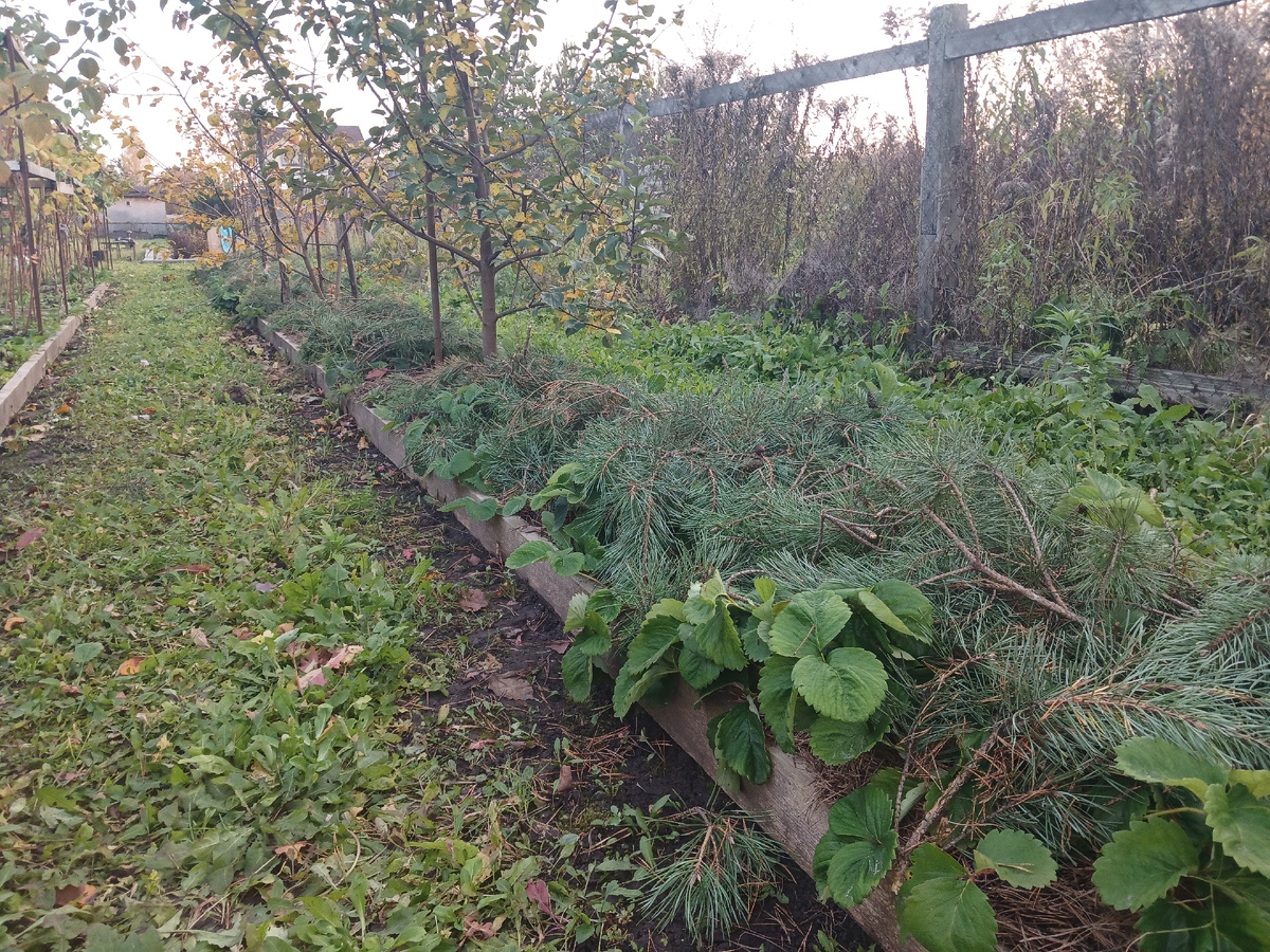 Начала с клубники, ее каждый год укрываю лапником. Сосен у нас полно за участком, проблем с укрывным материалом нет.
