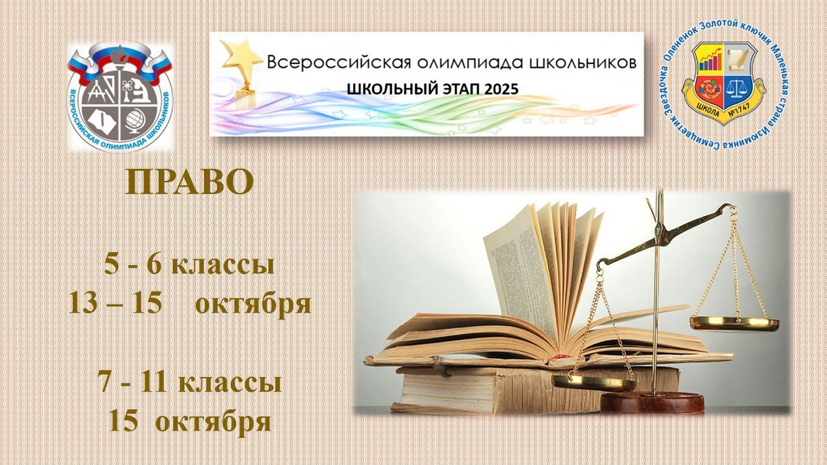 Дорогие ребята! 🤗 Приглашаем вас принять участие (с 13 по 15 октября 5-6 классы и 13 октября 7-11 классы) в школьном этапе олимпиады по праву. С 22 сентября 2025 года до особого распоряжения оргкомитета школьный этап всероссийской олимпиады будет проходить в резервной тестирующей системе https://online.olimpiada.ru/ Для участия в турах школьникам необходимо получить индивидуальные коды в своей школе. С заданиями прошлых лет можете ознакомиться на сайте: https: //vos.olimpiada.ru/archive/table/tasks/years/2024_2025 Памятка для участника: https://vos.olimpiada.ru/2025/school/memo Желаем удачи! 💐 #ДОНМ #ШколыКолледжиМосквы #Школа1747