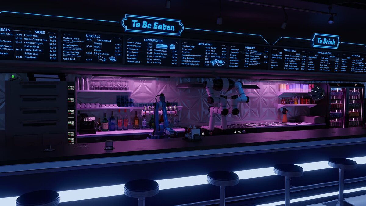 Когда я впервые увидел фасад Orbit One, внутри торгового центра iN City Plaza в районе Футянь, я подумал: «Ничего себе, это что-то из научной фантастики». На входе — приглушённый свет, металлические поверхности, полупрозрачные панели и лёгкий цветовой градиент, напоминающий иллюстрацию космоса. Внутри — мягкий неоновый свет, зеркальные «купола»-светильники, полупрозрачные экраны, откуда едва видны фигуры планет и звёзд. Всё словно декорации к фильму о путешествиях по галактикам. Но главное — под столешницами и вдоль стен — невидимые магниты и рельсы, по которым движутся «летающие тарелки» с блюдами. Когда официант отправляет вашу еду, вы видите, как мини-НЛО выезжает из стены, скользит по стеклянному столу и останавливается аккурат перед вами — словно приземляется. Иногда ощущаешь, что сидишь не в ресторане, а на борту межпланетного корабля. Такого эффекта не обещают многие тематические рестораны — но здесь концепт реализован по полной. В Instagram уже публикуют ролики, как блюда «ле