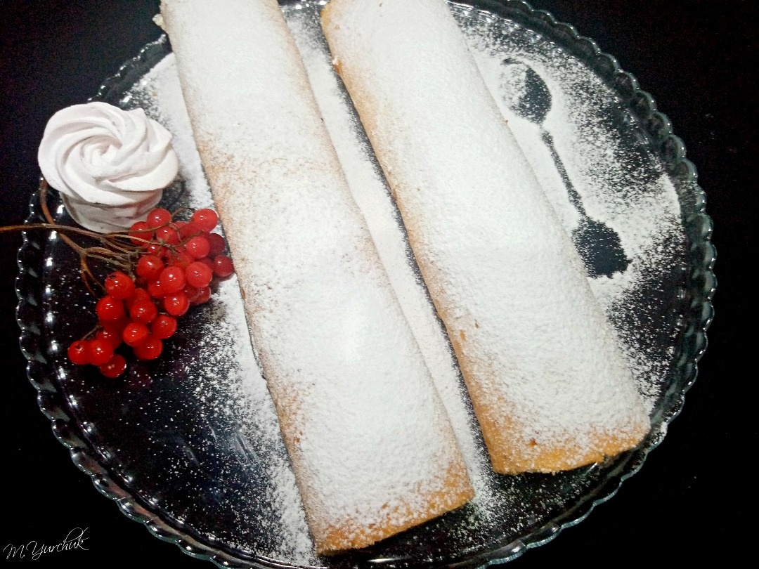 4. Сворачиваем бисквиты рулетом. Края отрезаем. Края первого бисквита можно развернуть и выложить во внутрь второго. И тогда уже завернуть рулет. Посыпаем сахарной пудрой или украшаем по вашему желанию. Готовьте с любовью и приятного аппетита!!!