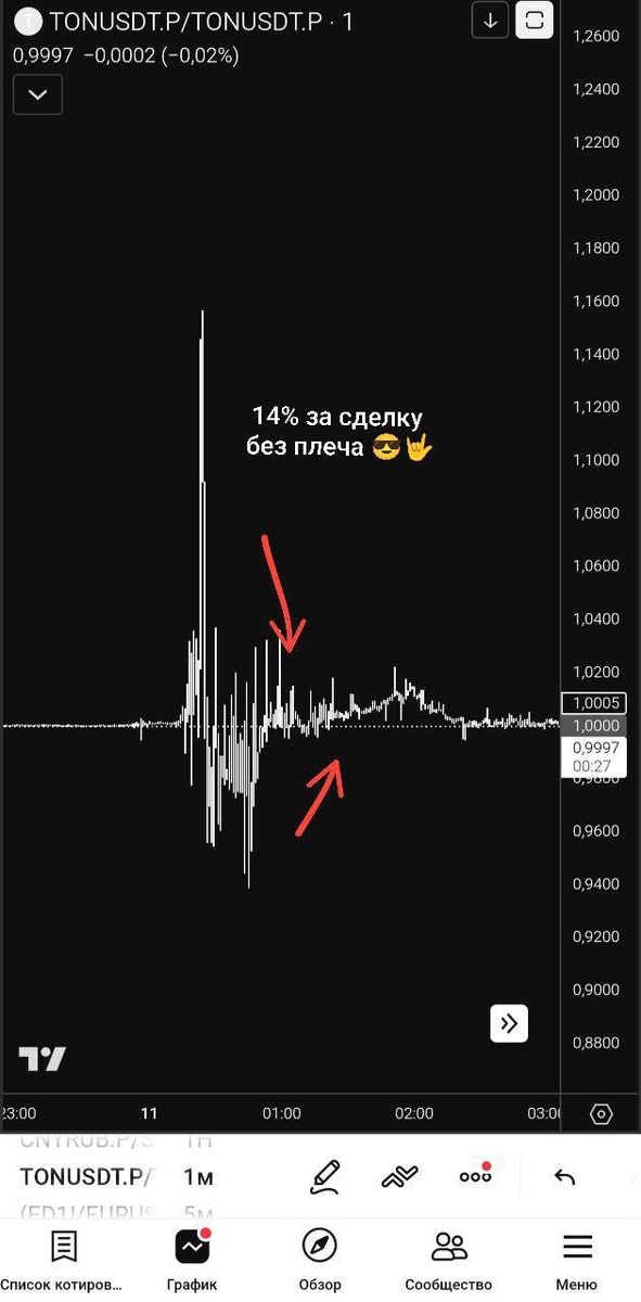 Так выглядела разница в ценах на монете TON. В моменте можно было забрать +14% чистыми 🔥