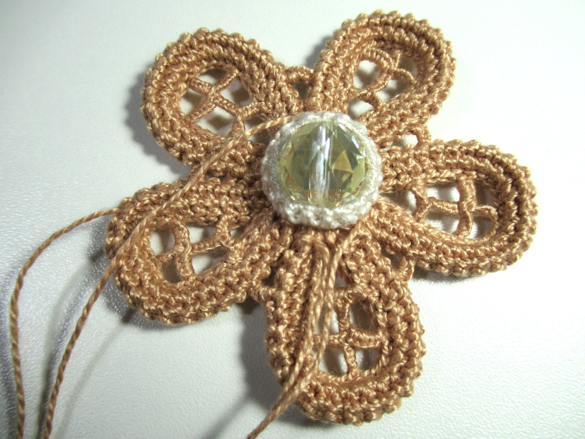 В этой статье я расскажу к сделать вязаный крючком цветок. Он сшит из вязаных крючком жгутов. Для создания цветка понадобится: 1 бусина диаметром 14 мм. (приблизительно 14 мм), 6 вязаных крючком жгутов. Один жгут длиной 18 столбиков без накида и высотой 5 рядов. Пять жгутов другого цвета для создания лепестков. Они длиной 25 столбиков без накида. Из жгута длиной 18 столбиков без накида делаем "оправу" для бусины. Для того замыкаем жгут в кольцо и к верхней части полученного кольца пришиваем бусину. Что делать если кольцо получилось меньше или больше бусины? Тогда перевязываем жгут с тем количеством столбиков, которое идеально окутает бусину. Из-за чего так получается? У разных людей разная плотность вязания. У меня может быть плотнее, поэтому и получилось 18 столбиков. У кого-то может быть более свободное вязание, или более плотное. В любом случае бусина не должна "болтаться" в "оправе". Далее к серединке цветка пришиваем остальные пять жгутов, равномерно распределяя их по длине окруж