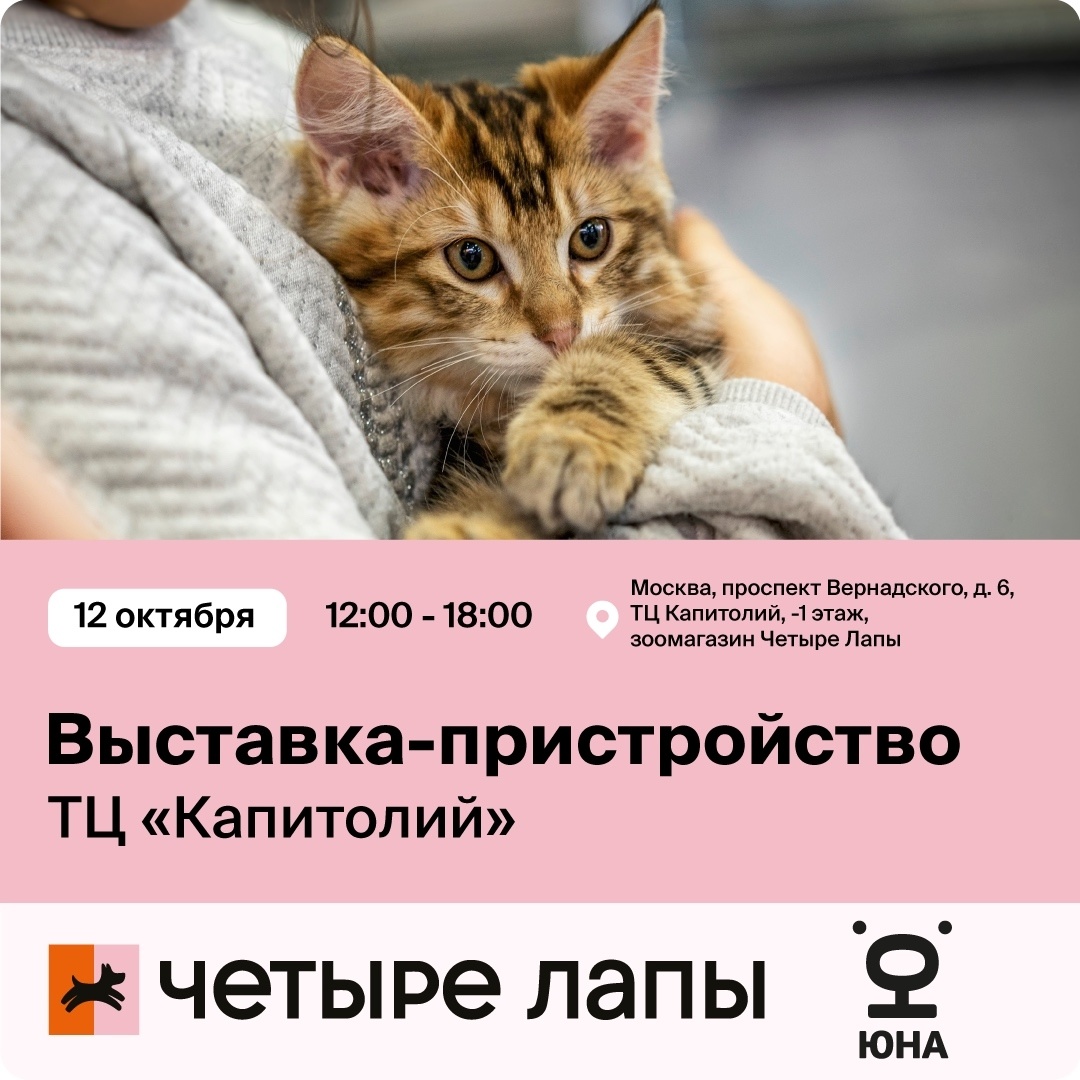 Друзья, рады сообщить, что наши усатые подопечные будут ждать вас 12 октября в ТЦ «Капитолий»! Это идеальная возможность, чтобы познакомиться с хвостиками, узнать информацию о каждом из них и выбрать идеального друга, который отправится с вами домой. 🎁 На выставке вас будут ждать 24 котика, а каждый новоиспеченный хозяин, выбравший себе питомца, получит подарки от сети зоомагазинов «Четыре лапы» и Центра «Юна»! Самое приятное – хвостики отдаются в добрые руки совершенно бесплатно, после прохождения беседы с зоопсихологом! Каждый котик привит и имеет все необходимые документы, а специалисты Центра «Юна» обеспечивают поддержку хозяев и консультации по здоровью и поведению на протяжении всей жизни животного! 📍ТЦ Капитолий (1 этаж, зоомагазин «Четыре лапы»; Москва, проспект Вернадского, д. 6) 🗓️ 12 октября, 12:00-18:00