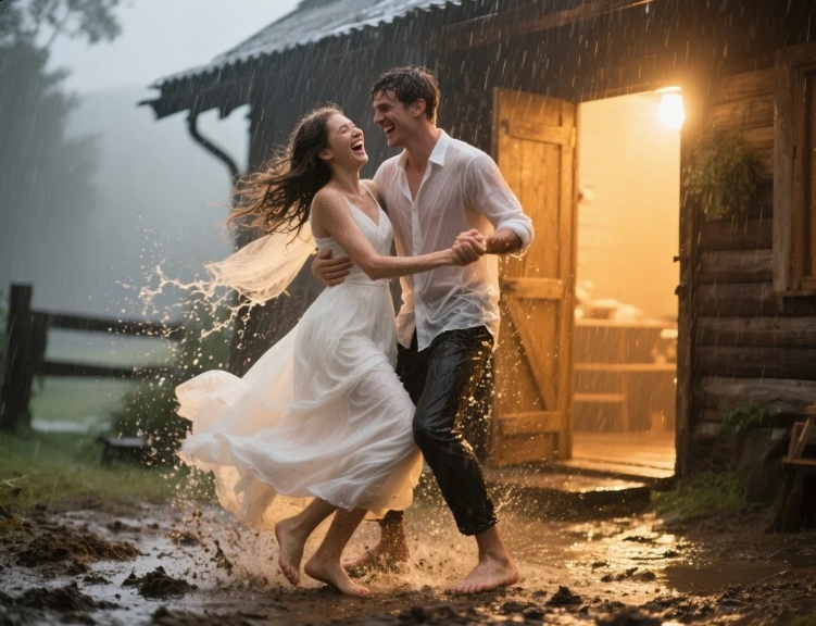 Он распахнул дверь, подхватил Катю за руку и вытащил её прямо на крыльцо, под эти проливные струи. Она сначала ойкнула, а потом запрокинула голову и тоже рассмеялась. И они пошли танцевать прямо по лужам. Босиком. Он - в своих городских брюках, она - в своём белом платье, которое тут же намокло и прилипло к телу.