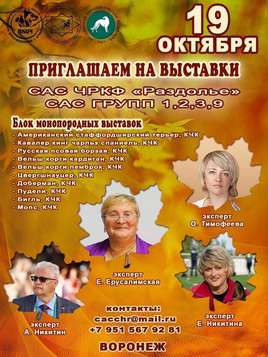 ⏰ 19 окт (7д) 🏛 #Воронеж #Россия #Выставка 🐶 Выставка собак: Раздолье 🏆 Кинологический центр Черноземья Контакты организаторов здесь: 🌐 https://www.petsman.ru/vystavki-sobak.php?mesto=18-voronezh САС ЧРКФ «Раздолье» САС групп 1,2,3,9 + special КЧП 🏆Блок монопородных выставок КЧК🏆 ✅Вельш корги пемброк ✅Вельш корги кардиган ✅Русская псовая борзая ✅Мопс ✅Бигль ✅Пудели ✅Кавалер Кинг чарльз спаниель ✅Цвергшнауцер ✅Доберман ✅Американский стаффордширский терьер 🧑 👨 Эксперты: 🔹 Ерусалимская Елена (Москва) 🔹 Тимофеева Ольга (Москва) 🔹 Никитина Елена (Воронеж) 🔹 Никитин Александр (Воронеж)