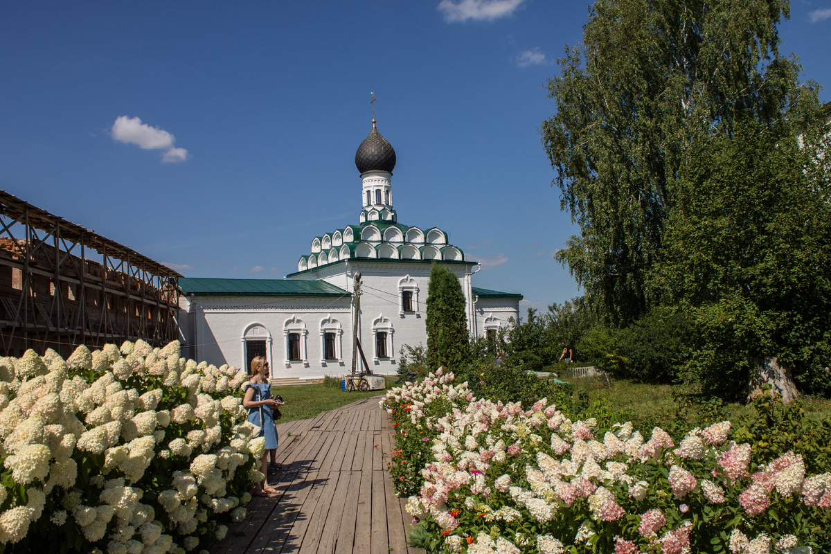 Несколько лет назад мы с Ольгой ездили в маленькое путешествие в соседний регион - Нижегородскую область. А если быть точнее, то посетили города Павлово на Оке и Ворсма. В Ворсме побывали в Свято-Троицком Островоезерском монастыре, который как понятно из названия, расположен на острове. Очень красивое душевное место, но поразило нас там то что большая часть территории монастыря отдана под посадки гортензии. Когда мы там были гортензии обильно цвели. Сочетание старинной архитектуры и цветущей гортензии очень впечатлили. И уже тогда зародилось желание тоже завести такую красоту. Ну на тот момент у нас ещё не было дачи, и вот только сейчас мы заложили свой цветник из гортензий. Растут у нас несколько сортов этих удивительных растений, но сегодня хочу рассказать об одном. Это - гортензия древовидная Белла Рагацца Муветта, так она правильно называется. Где то её называют просто Муветт.