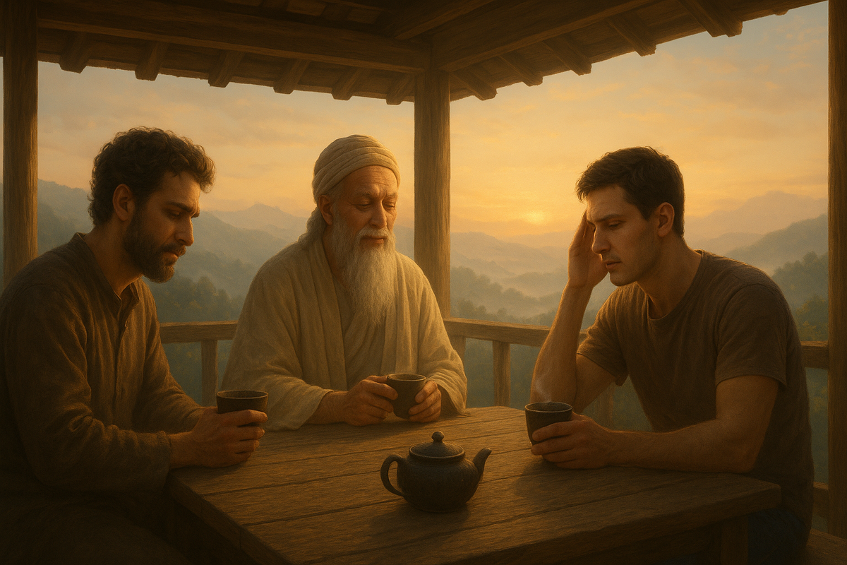 Утро. Горы. Легкий туман. Трое мужчин сидят у деревянного стола: Эпикур, Лао-цзы и Скептик.