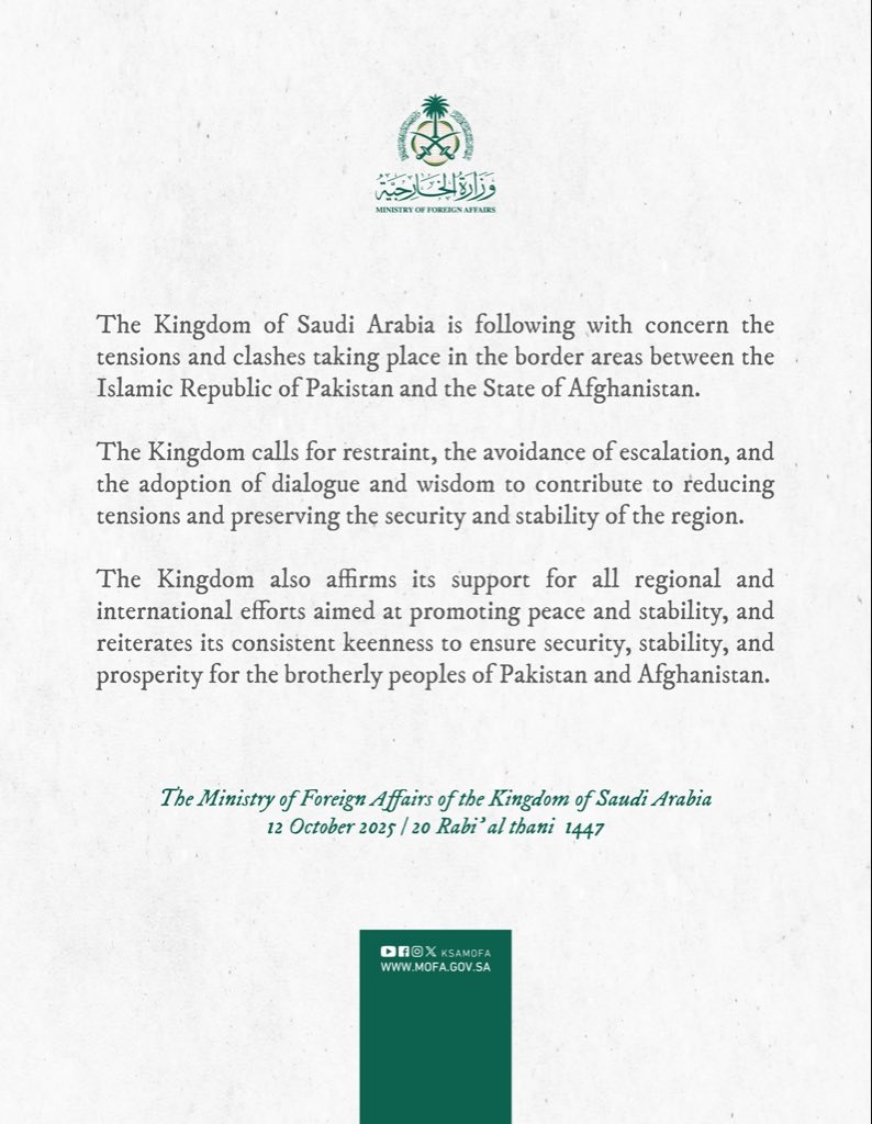 В ответ на пост Saudi Arabia CONCERNED by 'tensions and clashes' between Afghanistan and Pakistan Urges restraint, calls for IMMEDIATE dialogue