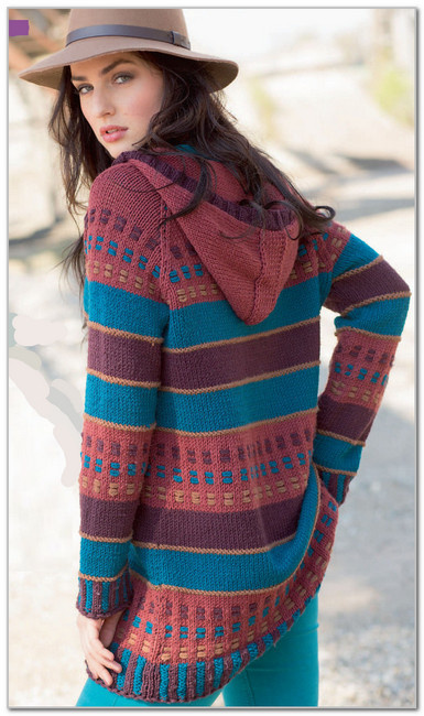 Разнообразные полоски в красивых, насыщенных цветах находятся в центре внимания этого жакета с капюшоном. Простые текстуры вязки придают движение узору. Рукав реглан, капюшон, цветные полосы - всё для уютной осени!