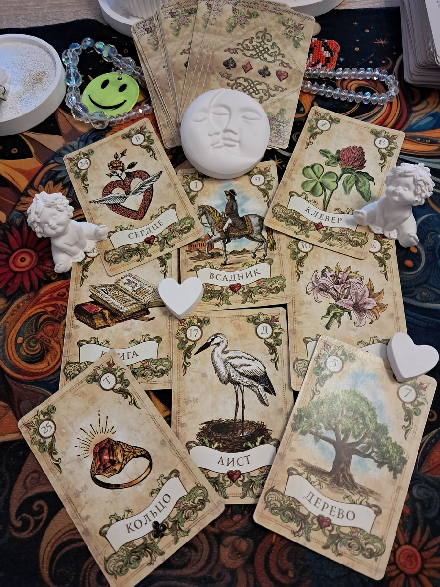 Какой прекрасный и глубокий расклад на 12 октября! Карты Ленорман выстроились в очень поэтичную и многослойную историю. Давайте расшиф руем его. Общая атмосфера дня на воскресенье 12 октября 🍁: Этот день несет энергию легкого, быстрого начала, за которым скрывается возможность установить глубокие, гармоничные и долговременные связи. Это день, когда небольшая удача (Клевер) может привести к чему-то стабильному и ценному (Кольцо), если подойти к этому со зрелостью (Лилии) и искренностью (Сердце).🤍 Толкование расклада на 12 октября 1. Всадник (Карта дня) День начнется с динамики,новостей, информации или какого-то движения. Всадник — это вестник, скорость, импульс. Что-то или кто-то "ворвется" в ваш день: · Неожиданное известие, сообщение, звонок. · Необходимость куда-то быстро съездить или срочно что-то сделать. · Встреча с энергичным, общительным человеком. · Новый проект или идея, которая потребует быстрой реакции. 2. Клевер Этот импульс(Всадник) несет в себе зерно удачи, небольшой, н