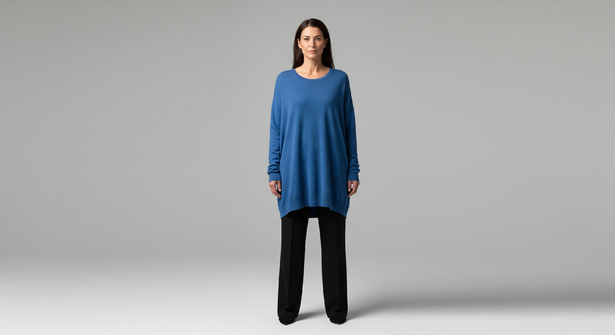 Это происходит, когда вы носите джемпер навыпуск с брюками на средней или низкой посадке. Линия "верх/низ" проходит где-то в районе бедер, разрезая силуэт на две примерно равные части. В итоге торс кажется длинным, а ноги — короткими. Идеальные пропорции — 1/3 к 2/3.