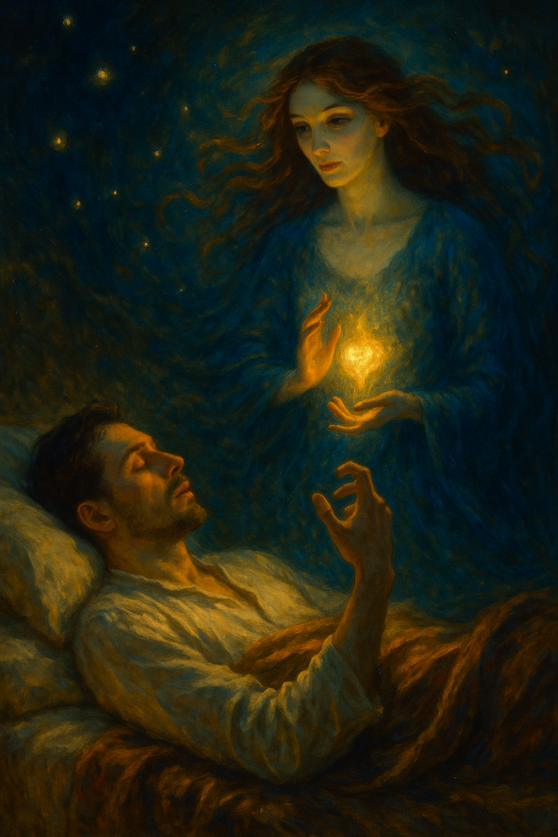 Он спит — и Тьма медленно растворяется в свете, похожем на дыхание. Вокруг — зыбкое пространство, будто сотканное из воспоминаний и желаний. Она появляется издалека — не шагом, не движением, а будто сама ночь приняла её образ. Её волосы колышутся, как отражение пламени в воде. Она смотрит на него — с нежностью, в которой есть и прошлое, и то, чего никогда не было. Он чувствует, как сердце наполняется чем-то живым, прозрачным, почти святой радостью. Всё кажется возможным: любовь, прощение, новая жизнь. Каждая черта её лица зовёт его ближе, но чем ближе он подходит, тем сильнее становится тревога. За светом стоит тень — в её улыбке есть тайна, в её взгляде — боль. Внутри него борются два чувства: он хочет остаться в этом сне, раствориться в нём, но знает — это обман. Его душа знает, что пробуждение будет холодным. Он понимает, что любовь — не только радость, но и потеря, что нежность может оставить шрам глубже любого удара. Он тянется к ней, и мир вокруг дрожит. Тепло её образа перелива