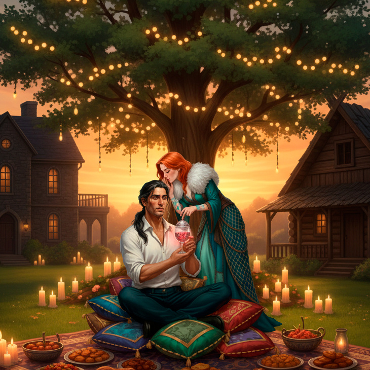 А Кира подошла к Рудольфу со спины и плавно опустила перед ним нечто. Жестом заправского фокусника она стянула ткань с изящного кубка из матового хрусталя, прикрытого крышкой. Она наклонилась к уху вампира и тихо шепнула, едва не касаясь того губами: - Это специально для тебя. Рудольф удивленно посмотрел на ведьму: - Это что? Зная тебя, ты явно что-то задумала. Очередной эксперимент? Энергетик? - он нахмурился. - Это мой добровольный дар тебе, - совершенно серьезно ответила Рыжая, даже без намека на иронию или издевку. - Мне будет приятно, если ты его не отвергнешь. Рудольф с сомнением посмотрел на кубок. За матовым стеклом было трудно понять, что внутри. Но точно угадывалась плещущаяся темная жидкость. Он осторожно приоткрыл крышку и тут же закрыл ее обратно. Вампир посмотрел на Киру побагровевшими глазами: - Ты с ума сошла? Книга 1: Книга 2: