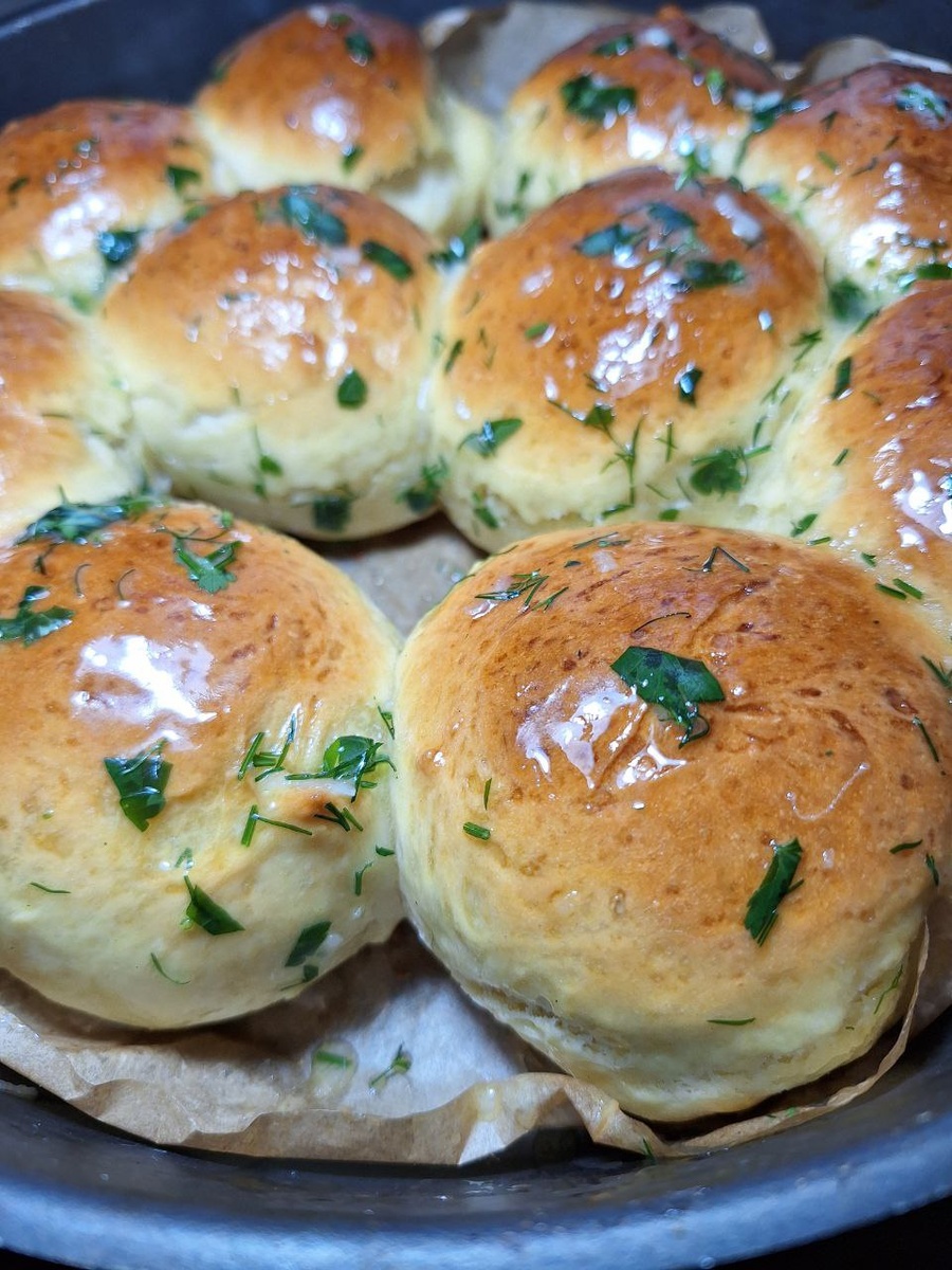 В миску вливаем теплое молоко и добавляем сахар, соль, яйца и дрожжи. Все хорошо перемешать и постепенно добавляем муку. Затем добавляем размягченное сл.масло и продолжаем месить тесто. Тесто получается мягким и слегка липнет к рукам. Оставляем в теплом месте для подъема на 1.30 часа. Стол присыпать мукой и выложить тесто, слегка обминаем и делим на шарики. Накрываем полотенцем и даем отдохнуть тесту 30 минут Затем смазываем желтком с молоком и отправляем в духовку на 180 гр на 30-40 минут. Достаем и смазываем размягченным сл.маслом с рубленной зеленью и чесноком. Приятного аппетита!