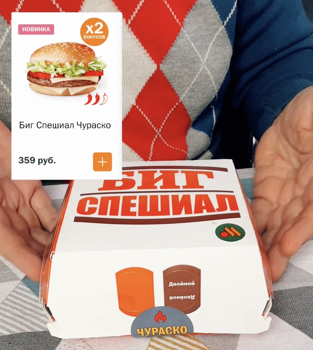 Продолжаю пробовать новинки и на этот раз взял "Биг спешиал Чураско" за 359 рублей. Для сравнения, обычный "Биг спешиал" сейчас стоит 338 рублей. Разница всего в 21 рубль. А стоит оно того?