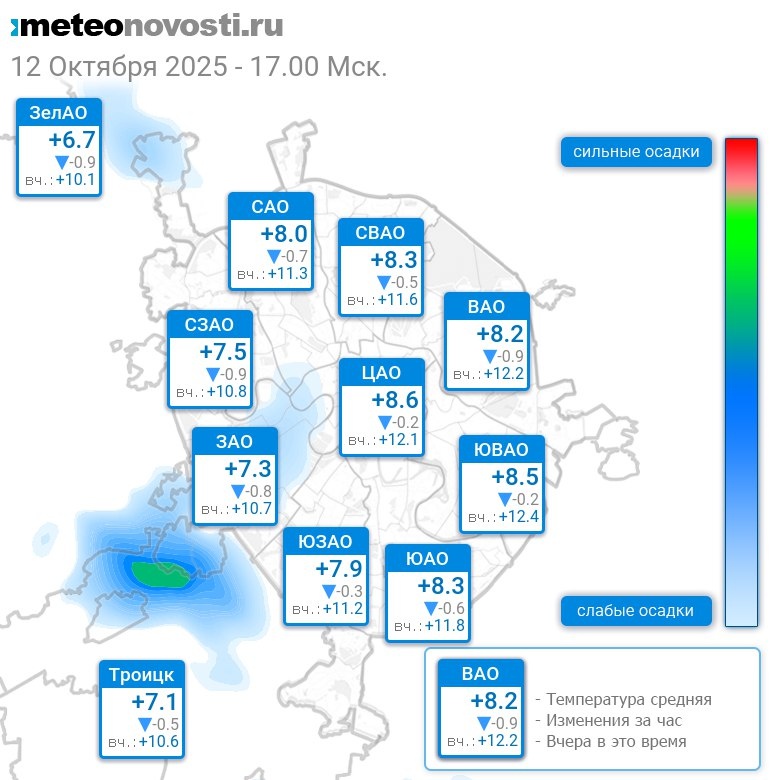 В 17:00 в Москве было от +6.5°C до +8.9°C, средняя температура +8°C #погода #Москва #осень #температура #12октября #воскресенье Перейти на сайт Прогноз погоды на 14 дней