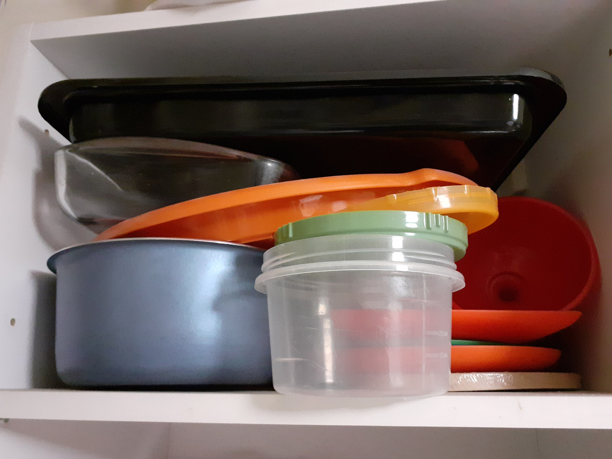 Есть вариант расхламления, когда все лишнее сразу выкидывается, а есть, когда по чуть-чуть, но каждый день. Во втором случае можно очищать небольшое место (полку, ящик или тумбочку) или некоторую категорию (например, одежду или посуду). Я применила два года назад первый вариант расхламления, его рекомендует Мари Кондо в своей книге "Магическая уборка", и выбросила больше десяти больших мешков вещей, еще часть вещей, в основном книги, была отдана на благотворительность, и еще часть увезена на дачу (теперь понимаю, что зря, но ничего, дача вместительная, подождет). На то большое расхламление у меня ушло две недели. Теперь вещи снова накопились, не уследила. Поэтому новый виток, но с другой последовательностью. Параллельно работаю со своей психикой и логикой мозга. Изгоняю страхи недостатка, учусь больше доверять Вселенной или Господу Богу. Итак, у меня есть полка на кухне. Одна из нескольких. И она была занята разными кухонными предметами. Я залезла на нее посмотреть, что же там в глубин