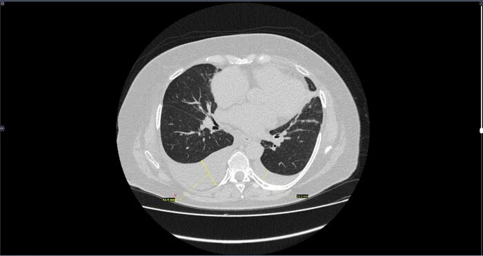 Гидроторакс — это скопление не воспалительной жидкости (транссудата) в плевральной полости — пространстве между легкими и внутренней стенкой грудной клетки. Двустороннее ассиметричное скопление жидкости плотностью +10-20 HU,с максимальной толщиной выпота справа -42мм,слева-16мм(ориентировочный объем жидкости справа-530мл,слева-157мл). Заключение: Двусторонний гидроторакс, средний по объему-справа, малый-слева. Классификация по гидроторакса по объему жидкости: -Минимальный до 50мл. -Малый 50-150мл. -Средний 150-500 мл. -Большой 500-1000 мл. -Массивный >1000мл. Классификация гидроторакса по уровню жидкости: -Малый -жидкость в пределах реберно-диафрагмального синуса. -Средней-жидкость от угла до уровня середины лопатки. -Большой — уровень жидкости выше середины лопатки. С диагнозом гидроторакс категория годности по ст.53(Временные функциональные расстройства органов дыхания после острого заболевания, обострения хронического заболевания, травмы или хирургического лечения),Г-временно не го