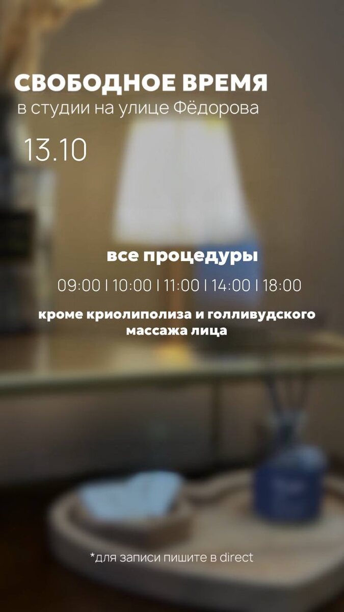 СВОБОДНОЕ ВРЕМЯ НА ФЁДОРОВА 13.10 • ONLINE запись • WHATSAPP Ждём вас к нам на процедуры 🤍