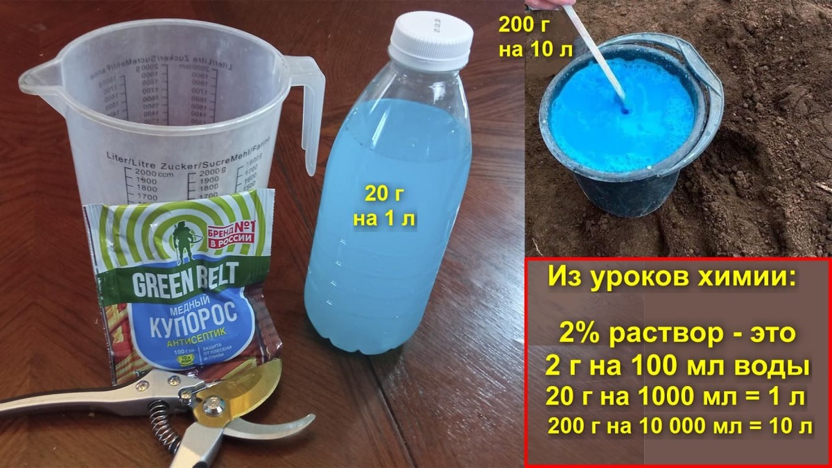 Сколько медного купороса брать для искореняющей обработки? Не забьётся ли опрыскиватель? Медный купорос растворяется БЕЗ осадка, он НЕ засоряет опрыскиватель. Не путайте с бордоской жидкостью - там кроме купороса МЕЛ! Его надо процеживать. Как растворять медный купорос? Растворять лучше в горячей воде и по нормам, которые несложно найти в Интернете. Сначала взять небольшой объем ГОРЯЧЕЙ воды - стакан или 0,5 литра. Растворить там нужное количество медного купороса, а потом довести раствор до нужного объема. Для искореняющей обработки берут либо 2% раствор - для роз (у них нежная кожица), либо 5% раствор - для деревьев. Это 200 г на 10 л воды (для роз) и 500 г на 10 л воды - для деревьев. Если у вас один куст роз или 1-2 плодовых дерева, то можно сократить объемы растворов. Пересчитать не сложно. Так, на 1 л воды надо 20 г купороса - это 2% для роз. И 50 г купороса на 1 литр - это 5% для деревьев (20 г купороса - это столовая ложка с большой горкой). Опрыскивать можно при любой положи