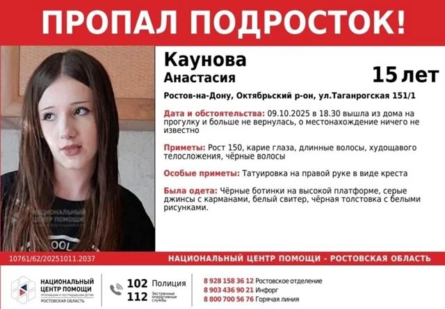 В Ростове-на-Дону уже третий день разыскивают 15-летнюю школьницу Анастасию Каунову, о местонахождении которой ничего не известно с 9 октября. Информацию о поисках распространил Национальный центр помощи пропавшим детям и волонтёрские объединения города. По данным родственников, вечером 9 октября около 18:30 Анастасия вышла из дома на улице Таганрогской, сказав, что идёт на прогулку. Девочка не вернулась домой и перестала выходить на связь. Сначала семья пыталась найти её самостоятельно, обзванивая друзей и проверяя знакомые места, однако поиски не дали результата. После этого родители обратились в полицию, и к делу подключились волонтёры поисковых отрядов. К моменту исчезновения школьница была одета в белый свитер, чёрную толстовку с белыми рисунками, серые джинсы с накладными карманами и чёрные ботинки на толстой подошве. Девочка худощавого телосложения, ростом около 150 сантиметров, с длинными тёмными волосами и карими глазами. На правой руке у неё заметна татуировка в виде небольшо