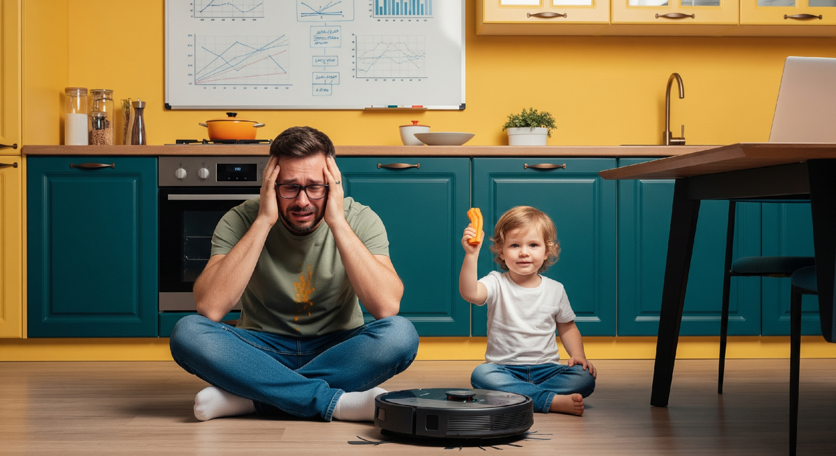 Я начала замечать тревожные изменения. Мой системный, оптимизированный муж стал… дерганым. Его стандартный ответ "процессы в штатном режиме" произносился теперь с нервным тиком. У него появились круги под глазами, и он начал пить кофе в промышленных масштабах. Одежда его перманентно была покрыта пятнами непонятного происхождения — смесь пюре, слюней и, кажется, акварельных красок.