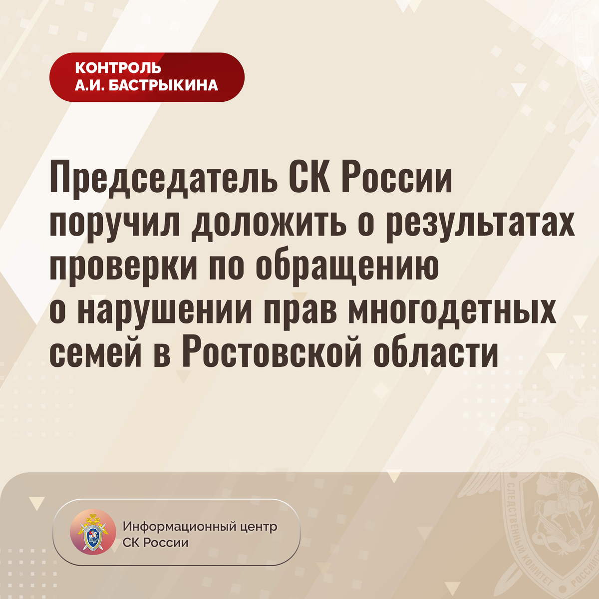 Председатель СК России поручил доложить о результатах проверки по обращению о нарушении прав многодетных семей в Ростовской области