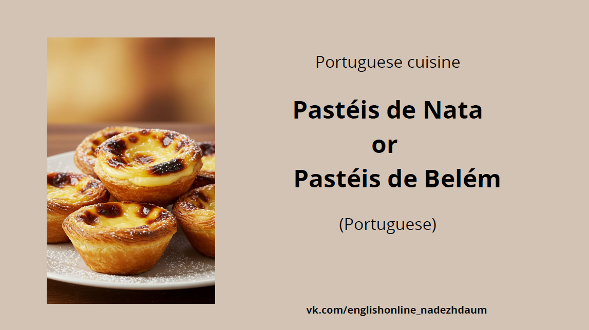 Изучая иностранный язык, Вы изучаете не просто слова и правила, но и культуру изучаемой страны, включая традиционную еду. Сегодня Вы познакомитесь с известным десертом «Паштел-де-Ната». Паштел-де-Ната - это пирожное из слоёного теста с заварным кремом. Такой десерт распространён в Португалии, Бразилии и в других странах. Пирожные были созданы монахами в монастыре Жеронимуш (порт. Mosteiro dos Jerónimos) в общине Санта-Мария-де-Белен в Лиссабоне до XVIII века. В 1834 году монастырь Жеронимуш был закрыт, а рецепт пирожного выкупили владельцы сахарного завода. Впоследствии они открыли фабрику Паштел-де-Белен, которая все ещё успешно выпекает знаменитые пирожные. Традиционная еда - популярная тема на уроках английского языка, особенно для тех, кто путешествует или живет в другой стране. ru.wikipedia.org #португальский_бразильский_самостоятельно #репетитор_по_английскому_языку_онлайн #традиционная_еда_на_английском