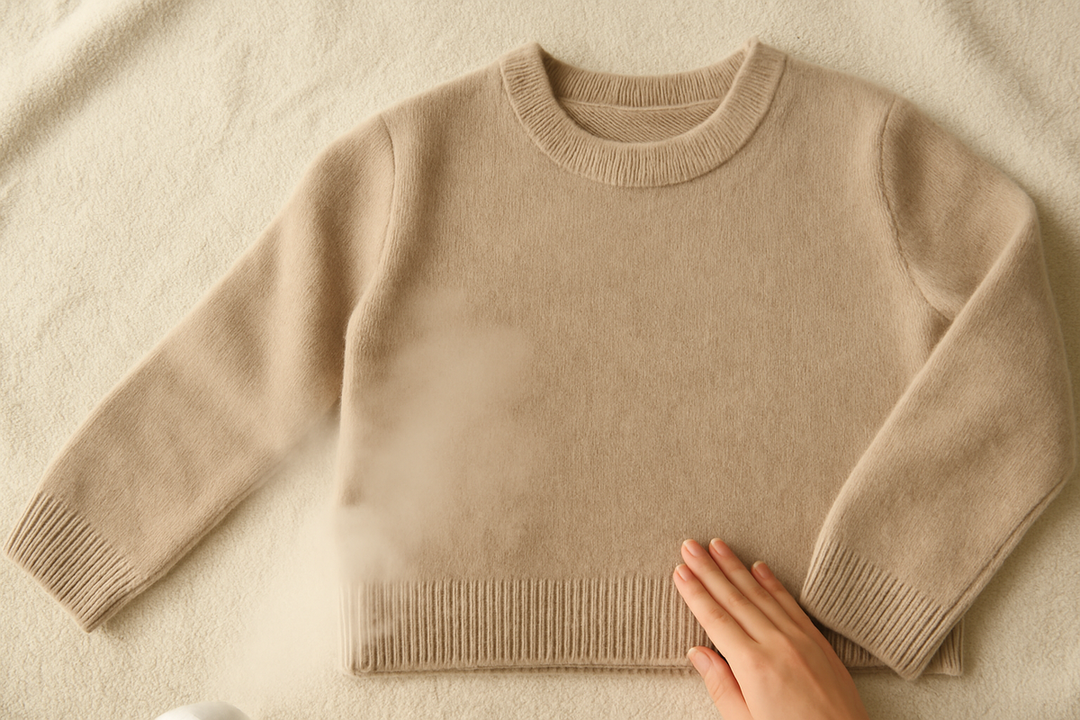 Хочется тепла, а свитер «царапает» шею и предплечья? Часто дело не в «плохой шерсти», а в сочетании трёх факторов: жёсткие торчащие волокна, сухая кожа и статическое электричество. Хорошая новость — это лечится домашним мини-сервисом: руками вы тратите минут 10, остальное свитер сделает сам. Ниже — быстрый план, что делать сегодня и как профилактически ухаживать дальше. (Работает для мериноса, овечьей шерсти, кашемира. Для мохера/альпаки — делайте аккуратнее и короче выдержки.) Зачем кондиционер? Он обволакивает торчащие кончики — свитер ощущается мягче у кожи. Разложите свитер на сухом полотенце, сверните «рулетом», нажмите сверху — вода уйдёт в полотенце. Раскатайте, придайте форму на сухом полотенце/сушилке: плечи, длина, манжеты ровно. Пока свитер влажный, пройдитесь отпаривателем с расстояния 3–5 см (или утюг на «пар» без касания) — по направлению петель. Пар пригладит ворс и снимет статику. Дайте высохнуть горизонтально вдали от батареи. Готово. Утром на шее будет ощутимо мягче.