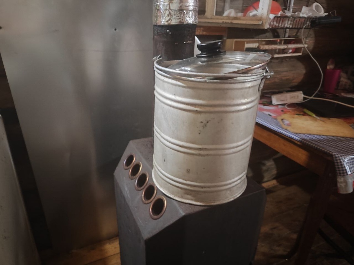 Утром у меня была горячая вода умыться, помыть посуду. После ужина я не мыла посуду, потому что умывальник с раковиной в предбаннике, а там нет света и холодно. Теплой вода оставалась почти все время. Потом нагревалась больше, когда я топила печку вечером. И довольно быстро.