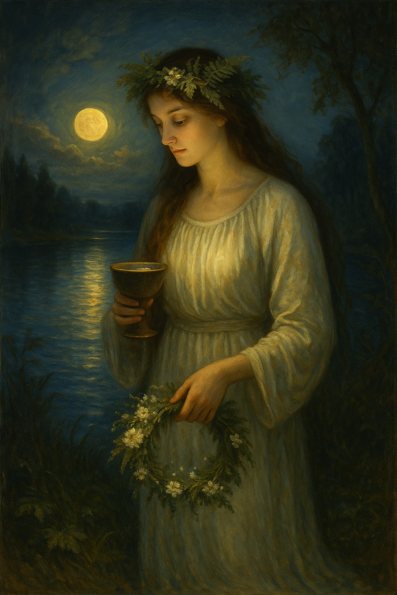 Она несла в руках чашу с родниковой водой — символ очищения, и венок из папоротника — символ тайного знания.