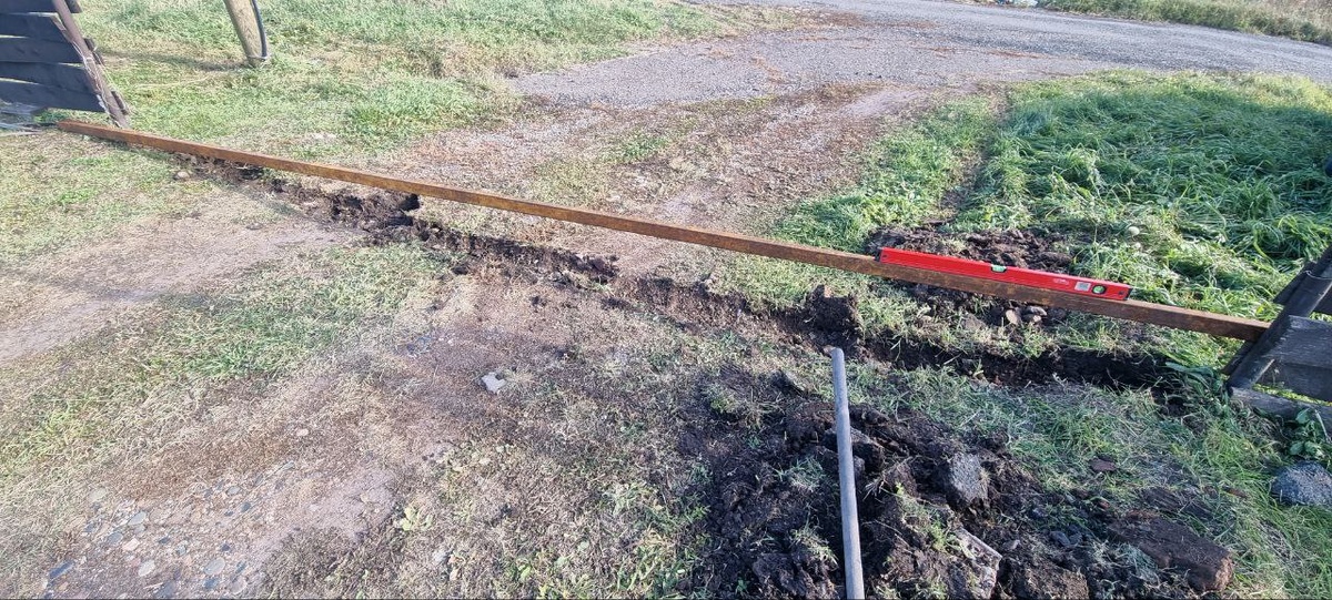Начал делать вьезд, распашные ворота. Перепад большой. Чтобы не перекосило, решил залить ленту между столбами. Столбы забурил на 1.5м. Высота ленты получиться 70см. К железной арматуре добавил остатки стеклопластикой арматуры, может добавит прочности🤔 пострадал мотобур