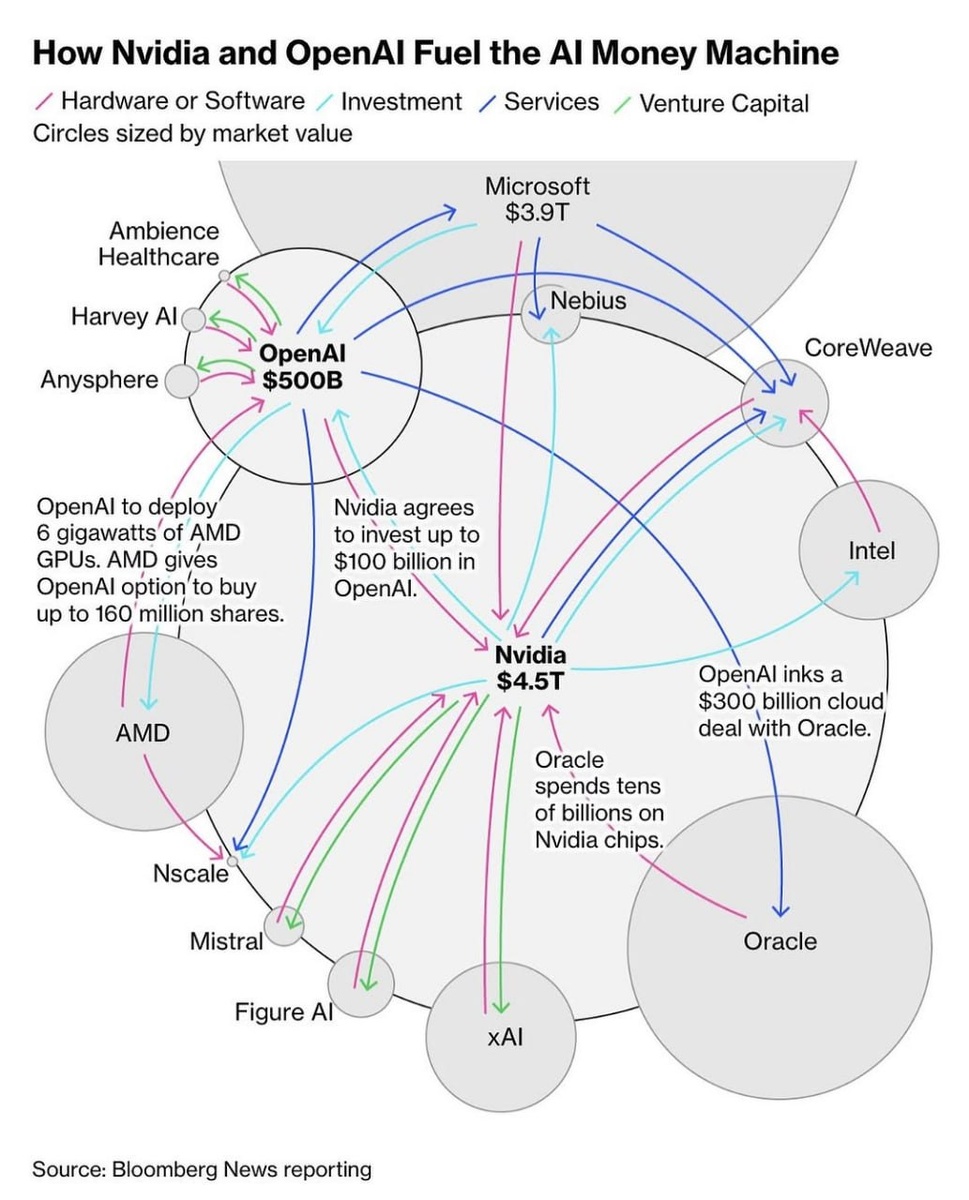 Вокруг Nvidia и OpenAI выстраивается замкнутая финансовая экосистема, фактически превратившая искусственный интеллект в «денежную машину». Nvidia обеспечивает индустрию мощностями, поставляя миллионы чипов и инвестируя до 100 млрд долларов в OpenAI. Последняя, оценённая уже в 500 млрд, отвечает за спрос: заключает рекордные контракты на облачные сервисы Oracle на 300 млрд и масштабирует инфраструктуру с помощью GPU от AMD. Microsoft, CoreWeave, Nebius и Intel поддерживают эту экосистему на уровне облаков и дата-центров, а стартапы вроде xAI, Mistral и Figure AI замыкают цикл, превращая вычислительные мощности в продукты и сервисы. Получается идеальная петля: Nvidia даёт вычисления, OpenAI создаёт спрос, а корпорации масштабируюют процесс. Машина ИИ-капитала набирает обороты — и уже работает сама на себя. ✅ Подписывайтесь в Max — https://max.ru/cyberfreek