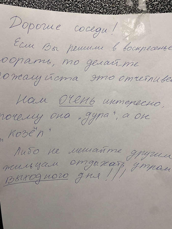 Сегодня у нас в лифте разместили такую записку. Мы с женой и сами часто слышим этих чудесных соседей, но кто-то не стерпел, или реально слушают как сериал. Обычно все начинается в будни в 7 утра. Скорее всего будят детей в школу и в сад. Мать неадекватно орет на детей. Дочь, видимо постарше, уже не выдерживая начинает фигачить в ответ (а может уже привыкшая слышать такой срач от родителей, просто повторяет). Иногда срутся друг с другом (с мужем), он платит ипотеку, все коммунальные платежи, а она заводится, потому что не живут богаче, Маша с мужем (видимо подруга), ездят то на Алтай то в Шерегеш, то в Турцию, а мы сидим. Денег ни копейки. А он работает и платит ипотеку платит за детей и уже порядком задолбался выражаясь вежливо, что она его ещё и пилит. Иногда сын выхватывает от матери или просто на него орут, что он сделал что-то не так. И орут дурниной. Даже если просто не выбросил мусор. Мужик любит смотреть рилсы или шортсы сидя на толчке, где бабы дуры, или требовательны, баба слу