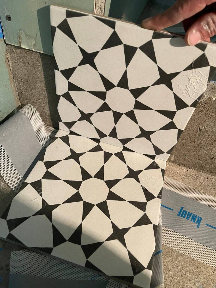 Когда используете плитку с орнаментом на стене и на полу, старайтесь ее укладывать чтобы рисунок логично перетекал с одной поверхности на другую Если этого не сделать-то сразу выдается непродуманность интерьера, как здесь А должен был рисунок переходить один в другой.