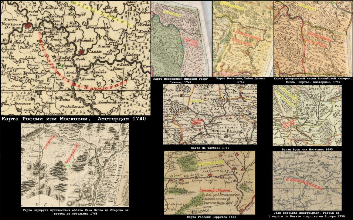 Об этом прямо сообщает князь Курбский (1552), которых встречает тех сразу за Сурой, также называя землю Свияжска чувашской. Черемисскими татарами чувашей называет Адам Олеарий (1633-1639). Нагорночермиская территория на картах отмечается от Козьмодемьянска до Симбирска и Самары. На карте 1759 года черемисы отмечаются на Нагорной стороне и в Закамье, при этом, уже в 1740-ом они фигурируют именно как нагорные. В 1768-ом на месте горных черемис находятся чуваши, марийцы же отсутствуют.