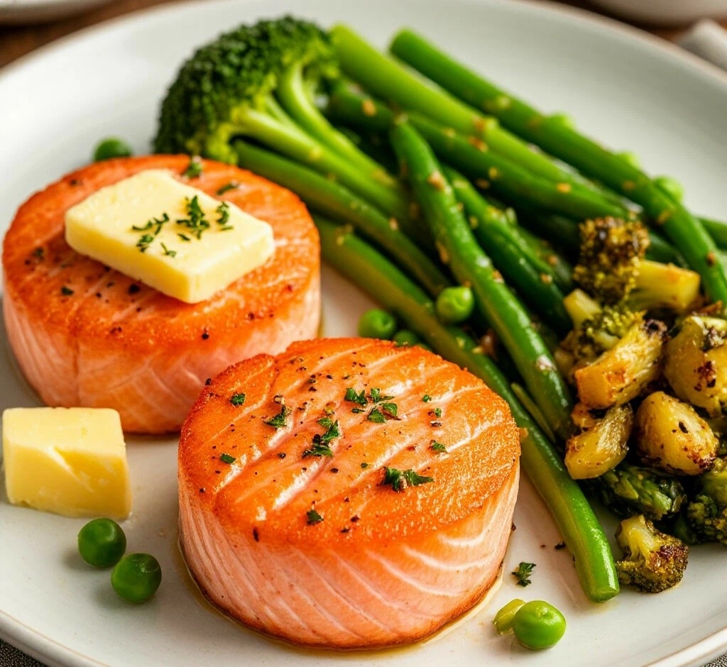 Воскресный ужин. Медальоны из семги с сырным кремом и хрустящими овощами Изысканное блюдо, где нежность семги встречается с пикантным сырным кремом и яркими зелеными овощами. --- Ингредиенты (на 2 порции): Основные: · Медальоны из семги – 6 шт. (разморозить) ·Плавленый сырок – 150 г ·Сливки 20% – 4-5 ст.л. ·Лимон – ½ шт. ·Укроп – 3-4 веточки Овощи и орехи: · Замороженная овощная смесь «Зеленый завтрак» – 300 г ·Кедровые орехи – 2 ст.л. ·Чеснок – 1 зубчик ·Оливковое масло – 1 ст.л. Анчоусное масло: · Сливочное масло – 50 г ·Анчоусы филе – 3 шт. ·Чеснок – 1 зубчик ·Цедра лимона – 1 ч.л. --- Пошаговая инструкция: ШАГ 1: Приготовление анчоусного масла 1. Масло оставить при комнатной температуре для размягчения 2. Анчоусы размять вилкой в однородную пасту 3. Чеснок пропустить через пресс 4. Смешать размягченное масло, анчоусную пасту, чеснок и цедру 5. Завернуть в пленку, сформировать колбаску, убрать в холодильник ШАГ 2: Сырный крем 1. Плавленый сырок размять вилкой 2. Посте