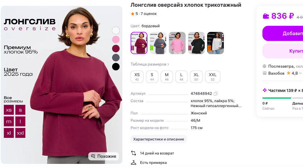 Начинаем с базы, но, честно, тут база совсем не про “скучно и просто”. Этот лонгслив — как чашка горячего какао в промозглое утро: мягкий, тёплый, расслабляющий и, главное, с настроением. Бордовый цвет — не просто оттенок, а целое настроение: чуть загадочный, насыщенный, словно осень в самом разгаре. А свободный крой будто нашёптывает — “расслабься, всё под контролем, стиль твой лучший друг”.